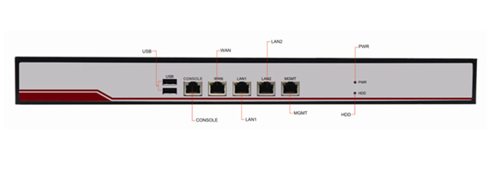 设备正面:接口:USB*2,CONSOLE*1,WAN RJ45*1,LAN1~LAN2 RJ45*2,MGMT RJ45*1